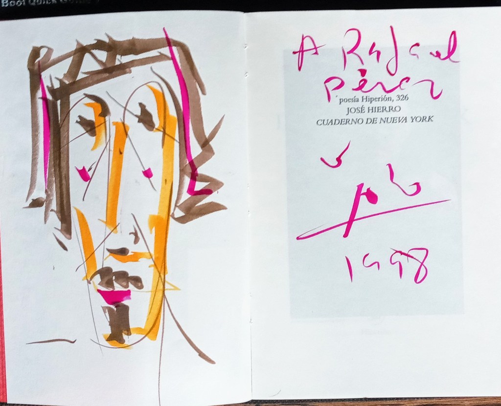 En la Feria del Libro de Madrid de 1998, volví a encontrarme con él en la caseta donde estaba firmando libros. Nos saludamos, me firmó “Cuaderno de Nueva York” y terminé en la caseta echándole una mano porque su hija tenía que ir a algún lugar. En realidad, mi trabajo fue de policía. Hierro se fumó un cigarrillo en cuanto su hija se fue. O dos. El caso es que mi labor era estar atento a la vuelta de ella para que no lo pillara fumando. Cuando llegó, Hierro me pasó el pitillo y yo me lo terminé ante la mirada reprobatoria de su hija.